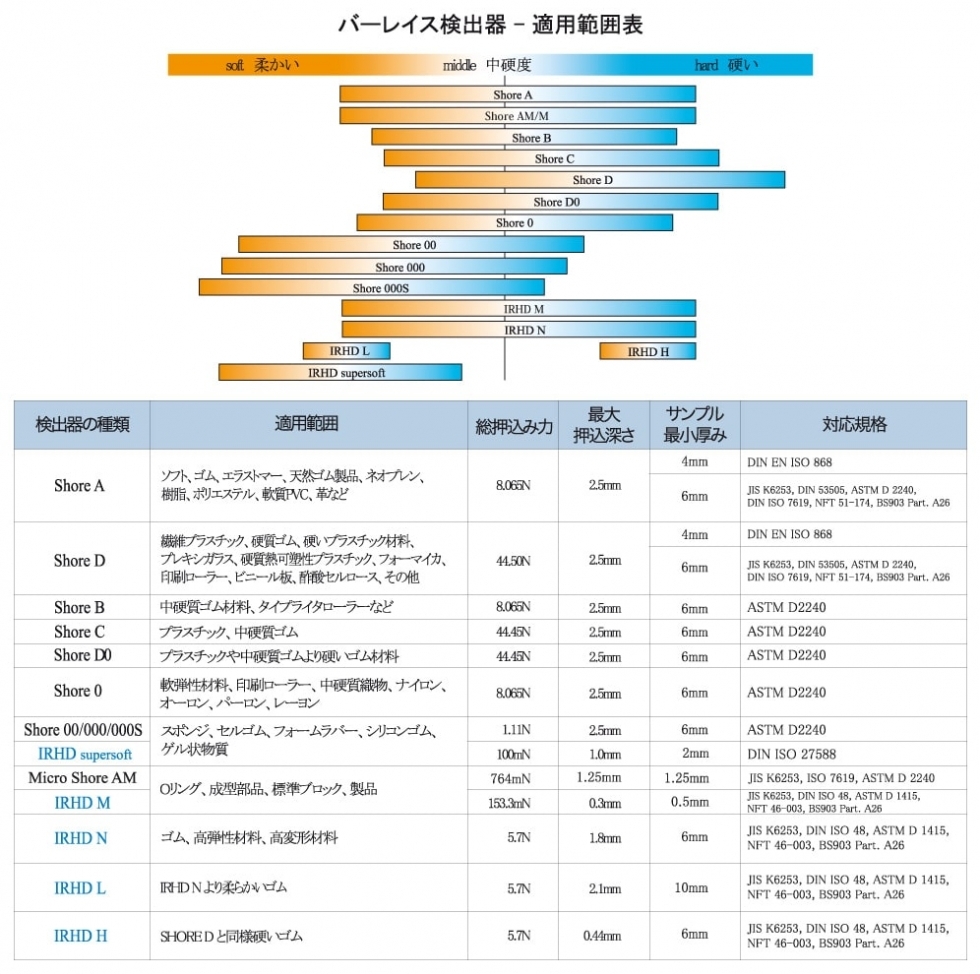 IRHDマイクロ、タイプAデュロメータをはじめとする、あらゆる硬度検出器が取り付けられ、 高硬度から超低硬度までのあらゆるゴムの硬さを測定できます。