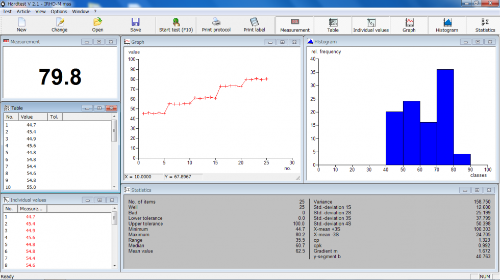 測定データ・グラフはもちろんのこと、品質管理に必要な統計データが自動計算されます。また、サンプルの良否の判定を自動的に行なうため、上限下限の管理幅を自由に設定できます。