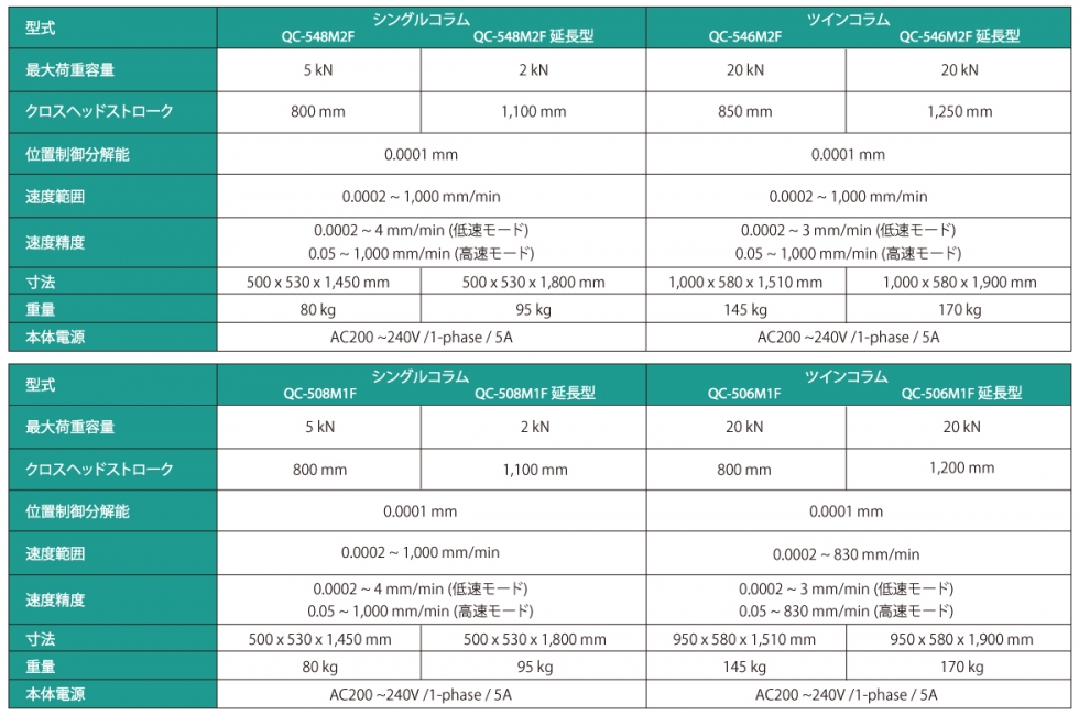 ツインコラムタイプのQC-546M2F万能材料試験機は広い試験スペースと長いクロスヘッドストロークで、最大荷重容量は20kNあります。サーボモータを採用し、再現性の高い位置制御と高精度の変位読み取りが可能です。さらに、手動ダイヤルにより、クロスヘッド位置の微調整ができます。