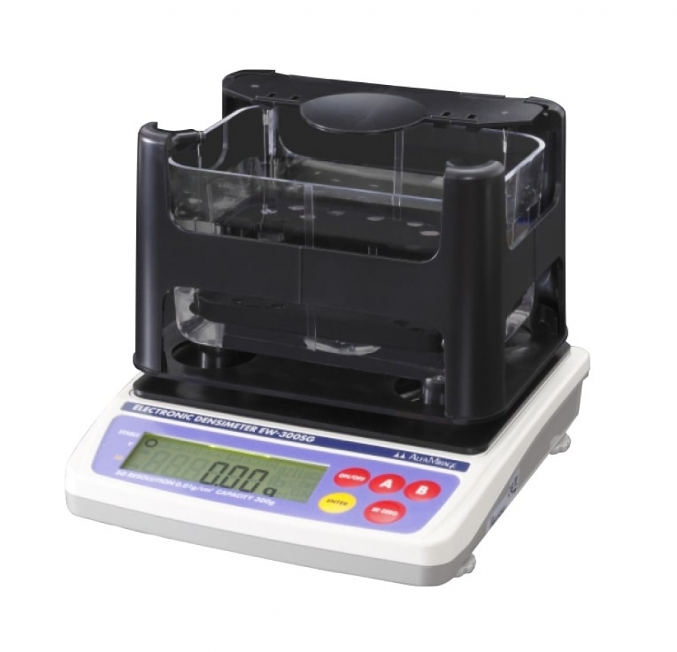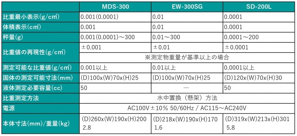 測定時間は約10秒、連続測定に最も適した比重計です。水の中に入れるだけで比重や体積が測定できるので、生産ラインでの抜き取り検査などに欠かせない1台です。比重と重量は、最小表示0.01まで測定できます。